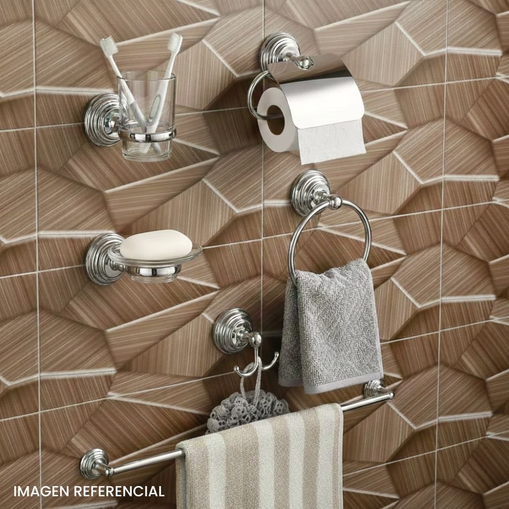 Set de accesorios de baño 6 piezas diseñado para brindar orden y elegancia en cada detalle. Incluye porta cepillos, porta papel higiénico, plato individual de vidrio esmerilado, toallero de mano, colgador y barra para toalla de baño. Elaborado con aleación de zinc y tubo de acero inoxidable, ofrece firmeza, durabilidad y un acabado moderno ideal para renovar tu baño con un solo conjunto.