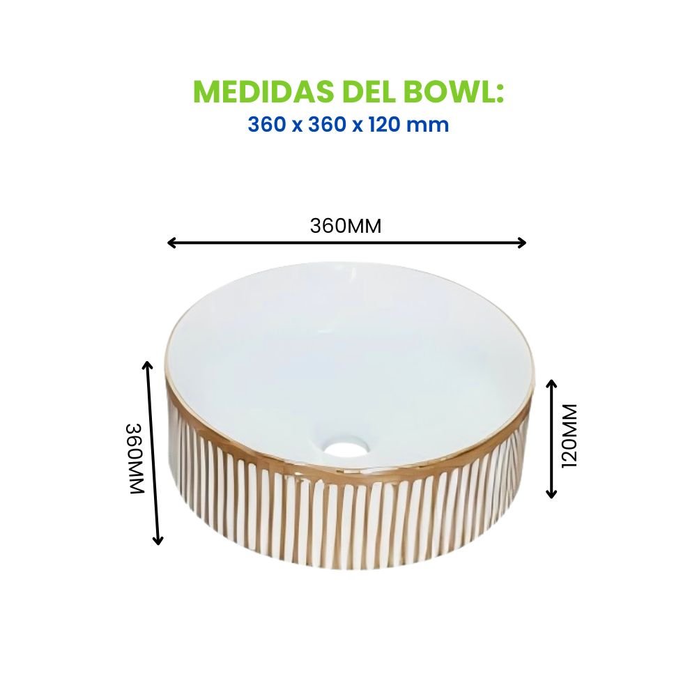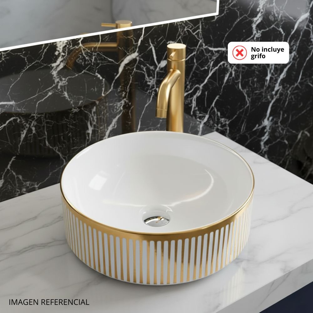 Lavabo circular en cerámica blanca con un diseño de rayas verticales en dorado brillante. Esta pieza tipo bowl es perfecta para añadir un toque de lujo y sofisticación ART DECO a tu baño.