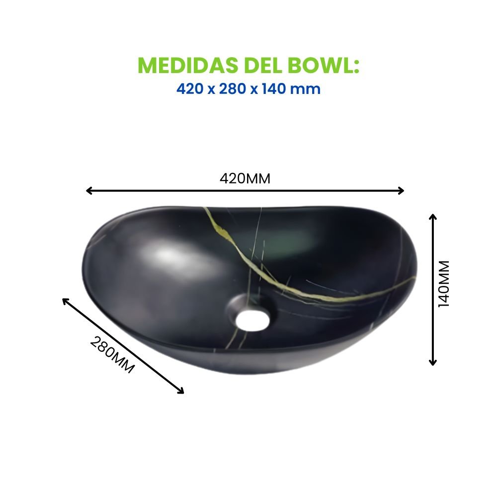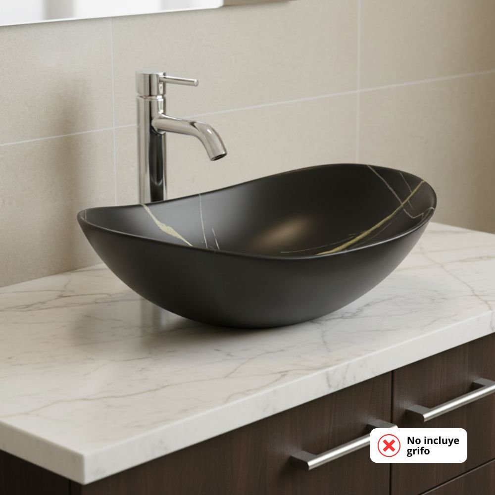 Lavabo Semi Luna fabricado en mármol negro mate con vetas naturales, ideal para una instalación moderna sobre encimera. Su diseño elegante y sus dimensiones: (420 x 280 x 140 mm) lo convierten en la pieza central perfecta para cualquier baño. (No incluye grifo).