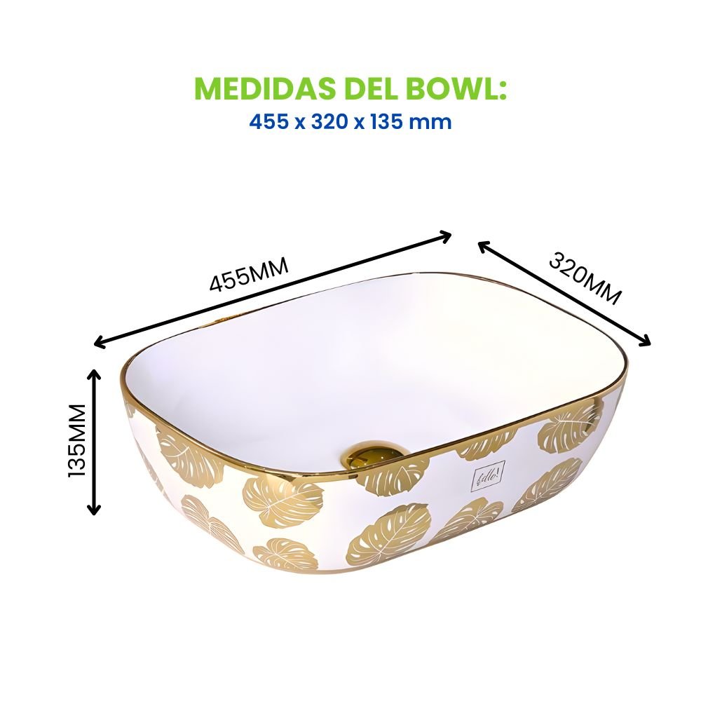 Añade un toque de lujo tropical y moderno a tu baño con este Lavatorio Rectangular de sobreponer. Su diseño en porcelana blanca pura se embellece con un exclusivo patrón de hojas doradas, creando un impacto visual sofisticado y memorable. Ideal para encimeras modernas, esta pieza no solo es funcional, sino que se convierte en la protagonista de tu tocador. Dimensiones: 455 x 320 x 135 mm.
