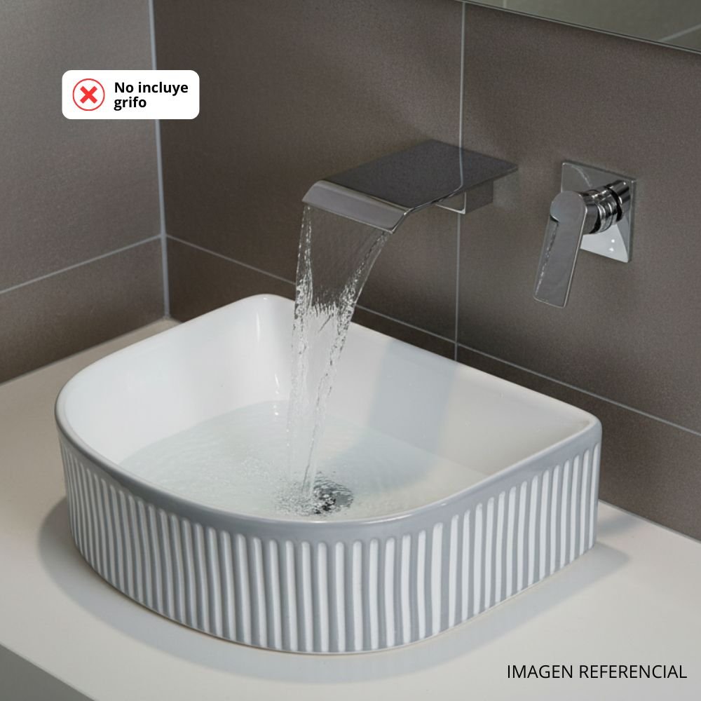 Lavabo circular en cerámica blanca con un diseño de rayas verticales en plateado brillante. Esta pieza tipo bowl es perfecta para añadir un toque de lujo y sofisticación Art Deco a tu baño.
