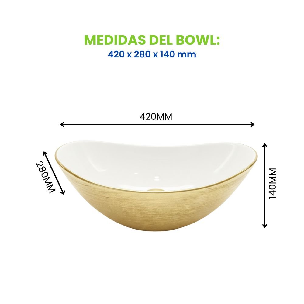Bowl Semi Luna con un espectacular exterior Dorado texturizado y un interior en blanco brillante. Su diseño bowl asimétrico (420 x 280 x 140 mm) es ideal para un baño que busca el máximo impacto.