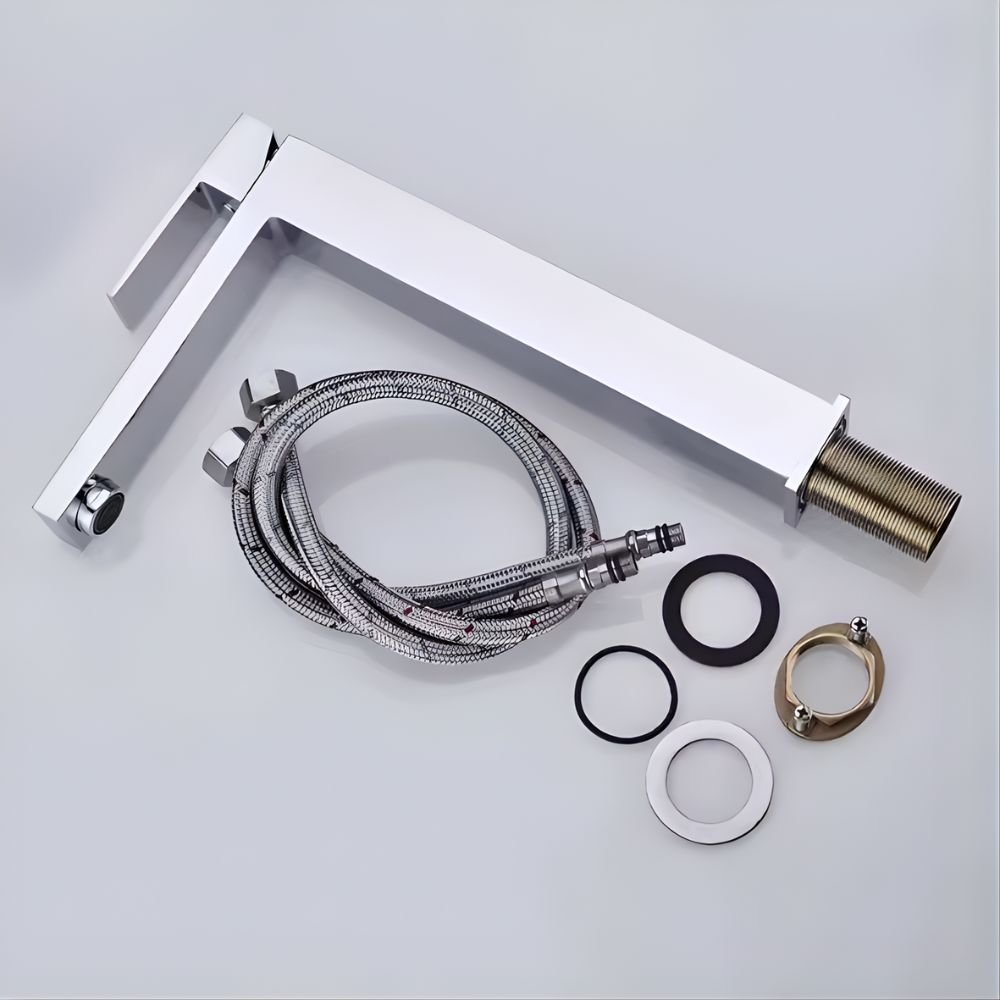 Diseño moderno de base cuadrada con acabado Plata Brillo (Cromo). Ideal para lavabos de sobreponer. Mezclador de agua Fría/Caliente con estilo elegante y minimalista. Medidas: 31,5 x 21,5 x 4cm