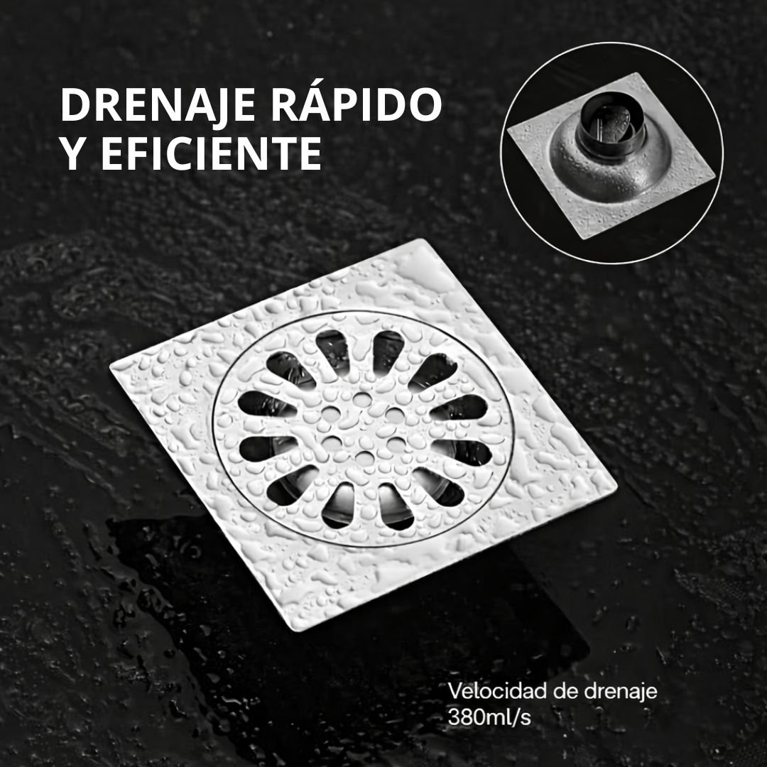 Sumidero cuadrado de ducha fabricado en acero inoxidable de alta resistencia, diseñado para una óptima evacuación del agua y una larga durabilidad. Su acabado elegante y moderno aporta un toque sofisticado al piso de tu baño, integrándose perfectamente con distintos estilos de porcelanato o cerámica.